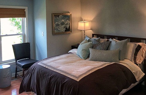 Three nice size bedrooms, master (queen bed) with private on-suite. 2 full baths. Kitchen with granite counter tops, stainless appliances, slate floors. Hardwood floors throughout. Private driveway with parking. Large landscaped yard with mature trees.