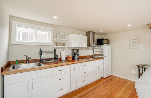 KITCHENETTE: 2-burner stove, microwave, refrigerator, dishware/flatware, drip coffee maker, 2 burner induction stove, Ninja Drip/K-cup coffee maker