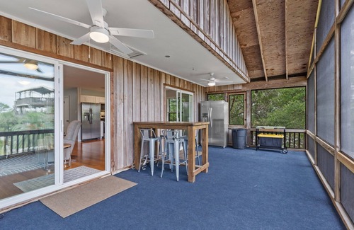 The outdoor living spaces are the best features of the house! The main floor has two oversized screened porches with stunning views. The front porch is equipped with a large ceiling fan, an oversized two person lounger to watch the most beautiful sunsets, as well as a ping pong table for those rainy days or much needed breaks from the sun! The back screened porch has two outdoor ceiling fans for maximum airflow, an outdoor high top table that seats 4, a drinks fridge for your brews and a bait fridge/freezer for the fresh fish you catch!
