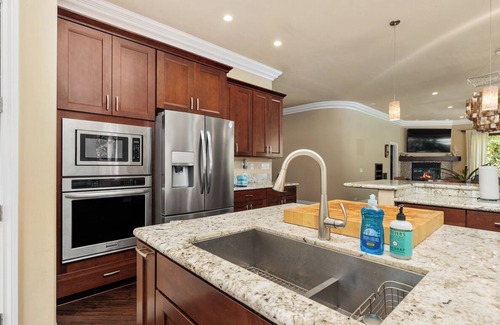 Relax after all your San Diego adventures in the large, open living room, which features a comfy couch, large fireplace and picture window that looks right out at the salt water pool. A 75-inch flat screen television with surround sound is a great option for catching the game or watching a movie together at night.