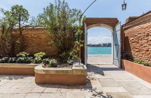 Secluded yet prominently placed near the renowned Church of 'I Gesuati,' Palazzo Gioiello can be accessed through a discreet arched double doorway directly from the Zattere. Stepping into its charming secret garden feels like entering a different world—a paved sanctuary adorned with raised flower beds and small trees, complete with an ancient stone well-head. The open-plan living area boasts two sets of French doors that seamlessly integrate the garden into the space, creating a refreshing indoor-outdoor ambience during the balmy summer months.