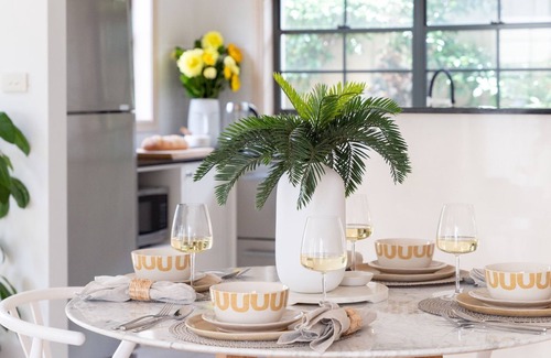 This light and airy coastal house is beautifully styled, thoughtfully furnished, and designed with relaxation in mind. With two bedrooms and two bathrooms, this stay is ideal for couples or a small family. Palm Breeze features a fully equipped kitchen and a furnished outdoor dining area with gas BBQ, making this home an entertainer's dream. The cosy home office is a fantastic addition and also makes this stay ideal for remote workers. The bedrooms are generously sized and lovingly decorated, and the rest of the interior is finished with chic coastal furnishings and décor.
