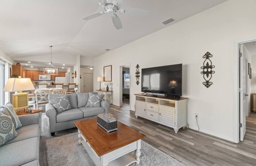 This property is appointed with all the comforts of home: Two-seater gas golf cart with golf cart bag holder, 2 bedrooms, 1 King, 1 queen, 2 baths, one with shower, other with tub shower. There is a pocket door in the guest hallway for your family and friends' privacy. Fully equipped kitchen. Outside includes enclosed lanai with loveseat and chairs, fenced in, pet-friendly courtyard with gas grill, dining area, and lounge chairs. Continue your relaxation in the evening hours with solar powered tiki torches.