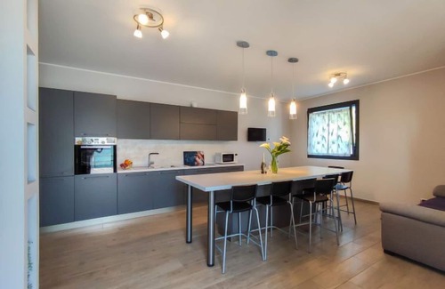 3-room apartment 70 m2, on the ground floor. Modern and stylish furnishings: living/dining room with TV. Exit to the terrace. 1 double bedroom. 1 room with 1 x 2 bunk beds. Open kitchen (oven, dishwasher, 4 induction hot plates, microwave, freezer, electric coffee machine). Exit to the terrace. Shower/bidet/WC, hydro massage shower. Gas heating, underfloor heating. Natural stone floors. Large terrace 100 m2 partly roofed. Terrace furniture, deck chairs (2). Marvellous panoramic view of the lake, the mountains and the valley. Facilities: children's high chair, baby cot for up to 2 year olds. Internet (WiFi, free). Parking (2 cars). Please note: non-smokers only. Private entrance. IT013077C2IL6KWHWQ