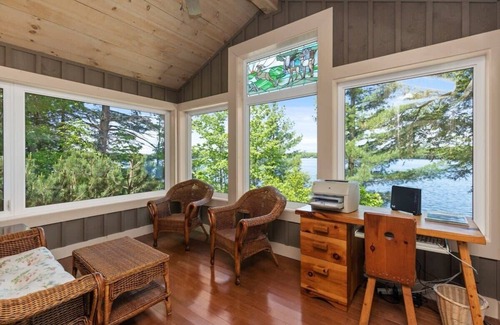 Main floor master bedroom is expansive which includes a large walk in closet, fantastic ensuite and private sitting room. Moving onto the west side of the cottage, you'll find a serene den overlooking the water - pull up a chair and delve into a novel! Additional main floor bedroom, and 4 piece bathroom is perfect for guests. The upper level boasts an additional 2 bedrooms, plus a private office for anyone wanting to work remote. Above the boathouse accommodation has a bedroom as well as a bathroom with shower. The bunkie is ideal for teens that want their privacy. With 500 ft of shoreline, the waterfront has a sandy beach area, with a gentle slope that gradually gets deeper the further you go out, plus a classic Muskoka granite and Jack Pine shoreline on the waterside of the cottage. The water depth at the end of the dock is typically approx 6 feet, but can vary from year to year. Bring your boat, or rent one through our Private Fleet - dock has plenty of room for water toys! Not the cottage does not have or need air conditioning, as it gets a fabulous breeze off the lake, and is protected by trees, so the cottage stays on the cool side.