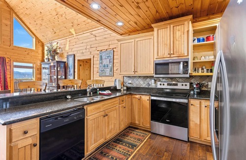 There is no reason to climb up and down the stairs for refreshments with a kitchenette located right there in the game room! Step outside the game room onto the lower deck of the cabin. Here you will find a gas grill and a large hot tub. All you have to do is relax and watch the sun go down over the mountains!