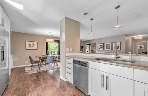 Gorgeously renovated 2 bedroom/ 2 bath apartment. Open floor plan with all brand new designer furniture. Large covered deck has comfy seating area and dining area. Dining table pulls out to seat 8. Large open concept kitchen with everything you need. Bedroom 1 has brand new memory foam Queen Bed and full bathroom across the hall. Bedroom 2 has brand new memory foam King bed with flat screen TV, comfy reading chair and attached bathroom with walk in closet.
