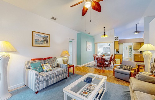The screened porch boasts scenic water views overlooking the canal and comes furnished for outdoor leisure or entertainment with features including patio seating and a Ping-Pong table. Interior shelf lighting creates an ambient atmosphere throughout the household living areas and the primary bedroom. Smart TVs let you stream all your favorite shows and movies when you're ready for some casual downtime. Home essentials include a well-appointed full kitchen, central air-conditioning, free WiFi, and a private washer/dryer.