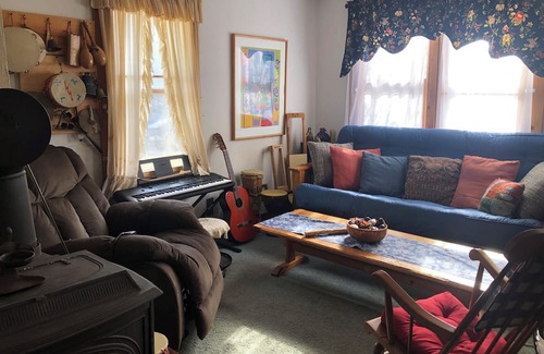 Come stay in this comfy art-filled home between two artist studios in beautiful Brooksville, Maine, minutes from a classic Maine beach, close to nature sanctuaries and hiking paths, one hour from Acadia National Park, and 15 minutes from Blue Hill, with grocery and gift stores, laundromat, banks, etc. It is home to a rich classical music scene, including Kneisel Hall chamber music summer school. One mile down the road is Tinderhearth Bakery, home of New York Times’ favorite pizza and brick oven bread. From chairs in our front yard, you can watch the sun set across the hay field and behind the trees on Wharf Road.