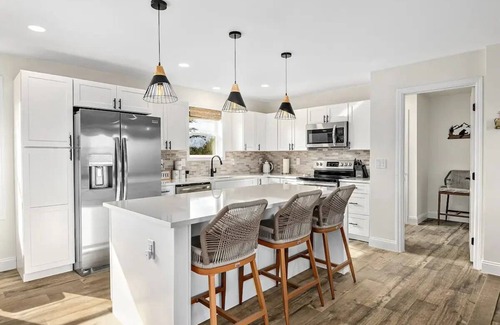 Have a few drinks on the front porch while the designated family chef prepares tasty bites in the kitchen. Once the food is ready, serve it on the dining table and savor a delicious feast with loved ones. The inviting kitchen island offers a perfect setting for breakfasts, snacks, and smaller meals.