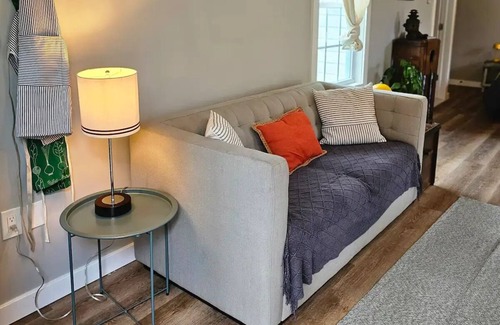 Whether you're looking for a single night's retreat or a prolonged getaway, this quaint and tranquil cabin awaits you. Relish in its surroundings, featuring a cozy fire pit, a picturesque meadow, and a tranquil pond.