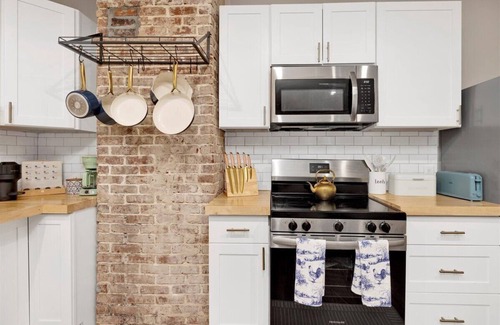 Our house is a hidden gem tucked away in an urban, up-and-coming neighborhood. While the surrounding area may have a lived-in feel and the entrance is accessed through an alley, the home itself is on a large lot, very thoughtfully designed, comfortable, serene, and private.