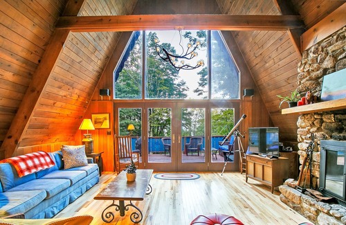 Peaceful Mountain A-Frame Chalet - Hike & Explore, stone fireplaces & ping pong! is located in Wolf Laurel. Peaceful Mountain A-Frame Chalet - Hike & Explore, stone fireplaces & ping pong! provides accommodation, featuring Balcony/Terrace, Bedding/Linens, Child Friendly, among other amenities. This Ski Chalet features Balcony/Terrace, Bedding/Linens, Child Friendly, to make your stay a comfortable one.