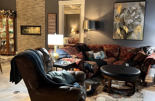 A beautiful cozy home in the Meridian district, right next to Riverside Park and the Meridian Walking Bridge. Bring your boat to launch just down the street to fish or water-ski the Muddy Mo! Take a quiet stroll along the historic Missouri River trails, later on take a quick walk to whatever your heart desires from our friendly and delicious coffee shops, to boutique shopping, restaurants, event venues, bars and breweries all nestled in our historic downtown Yankton Meridian District. You'll have all the space you need within this beautiful open concept living and full kitchen featuring a large island and a separate breakfast bar to seat all of your family and friends. Keep warm beside the unique fireplace located between the kitchen and master suite, along with amazing heated tile floors in this space for those chilly months. Let's not forget the beautiful view out of the huge patio doors and deck from the mentioned space. You'll find a spacious master bedroom featuring coffered ceilings, it's own living space with a 65in. smart TV, king adjustable bed with an ensuite bathroom consisting of a large walk-in tiled shower, dual sinks and a large laundry room and storage. The living room includes a queen size murphy cube bed that can be set up in just minutes. Moving down to the second bedroom you'll find a Tempur-Pedic king bed and a twin bed with a half bath ensuite. Each room has it's own mini-split to dial in your desired room temp. You'll find every need fulfilled for you and your family within this luxurious space!