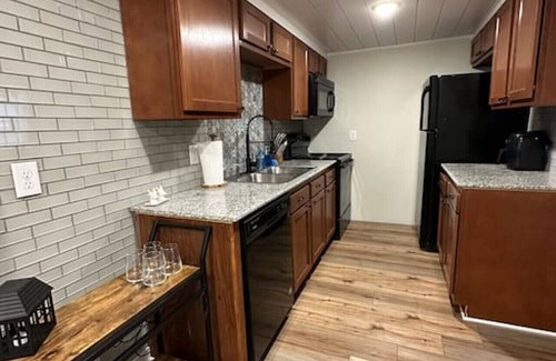 Upstairs: You’ll be greeted in the living room by gorgeous vaulted ceilings and shiplap walls. Snuggle up on the sectional and turn on the 55 inch smart tv or take a seat at the built-in bar to enjoy a meal. With a connecting living and kitchen area you’ll be able to spend quality time with your entire group without missing a beat!