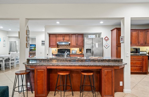 As soon as you walk through the door, you'll know you're on vacation. The open concept living area with a large kitchen island and dining area is perfect for family gatherings. Sink into the comfortable furniture in the living room while you watch TV or enjoy a good book. The master bedroom features a King bed, en suite bathroom, walk-in closet, and flat-screen TV, and the second bedroom has a Queen bed. The kids will love their own dedicated space with a twin trundle bed, TV, and plenty of board games to play.This home features 2 twin size sleeper chairs and a crib.