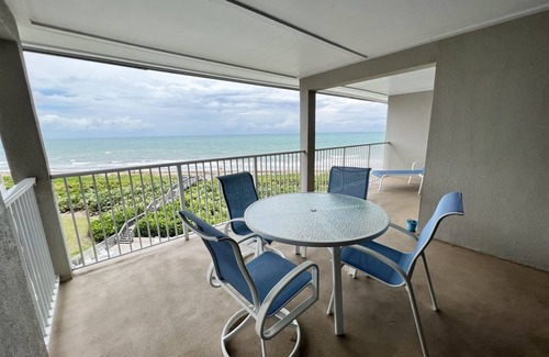 Rent this beautifully updated 2-bedroom, 2-bathroom, fourth-floor oceanfront penthouse condo in the desirable Pelican Building of the Resort Villas at Indian River Plantation Resort. From your private balcony, take in sweeping views overlooking the Resort Villas community swimming pool, the sandy shoreline, and the sparkling Atlantic Ocean beyond.