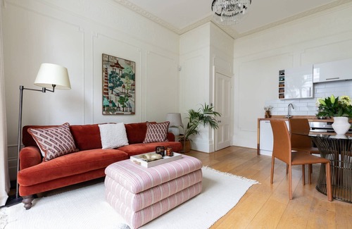 Up to four guests can embrace the coveted Notting Hill lifestyle from light and airy Pembridge Villas VI. With an exceptional location on a wide tree-lined avenue, this extremely well-appointed home showcases the best of Notting Hill, from the eclectic shopping and dining opportunities to the picturesque green spaces and Victorian architecture. Royal Oak and Bayswater underground stations are just over a ten-minute stroll from the home, connecting you to the rest of the city with ease. At the front of the home, the open-plan living room and kitchenette are flooded with natural light. This space impresses with high ceilings and a beautiful floor-to-ceiling window, overlooking traditional white stucco architecture and frondy palms. Period features, like the cast iron fireplace and ornate mouldings, integrate with stylish seating and a contemporary dining set – perfect for enjoying meals rustled up in the thoughtfully designed modern kitchenette. The two warm and welcoming bedrooms share a fresh, modern bathroom and are brimming with character. The primary bedroom, with a double bed, is a lesson in contemporary cosiness, with charming heritage wallpaper, a plush velvet headboard, and an ottoman. Its French doors open onto a desirable Juliet balcony. The second bedroom cocoons with cooling blue hues that accentuate the ornate fireplace and sophisticated wood panelling. There's a king-size bed with a bold mustard headboard and a delightful candy-stripe window seat. An abundance of cafés, boutiques, and fashionable independent stores greet you at chic Westbourne Grove, just minutes from your front door. The vibrant markets and boutiques of nearby Portobello Road are not to be missed, while leafy Hyde Park and Kensington Garden offer tranquil moments after the hustle and bustle of the city. A wonderfully global dining scene surrounds Pembridge Villas VI, with some of the best restaurants in the capital, including Dorian, The Ledbury and Core by Clare Smyth. After supper, you can head to the iconic Electric Cinema or catch a live music performance at the Notting Hill Arts Club.