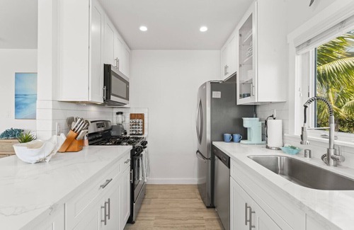 Welcome to your Laguna Beach penthouse! This designer 1 bed/1 bath retreat features a king bed and stylish coastal interiors. Enjoy amazing 180° ocean views from the interior of your home as well as the ocean deck with outdoor furniture and a cozy fire pit. Just steps to Victoria Beach, tide pools, and seaside strolls. Dine next door at the acclaimed Drake with live jazz and fine cuisine—relaxation and luxury await. The downtown trolly stops in front of our home and did we mention we have AC!