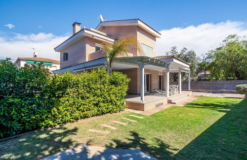This 5-bedroom villa is located in the quiet and peaceful residential area of La Mora in Tarragona. The villa is situated at a short distance from the beach (650 m), bars, restaurants, pharmacies, shops and supermarkets. Perfect for a quiet relaxing family holiday. The villa has a large outdoor parking area for 2 or 3 cars, a private swimming pool (10 x 4), a spacious shaded porch, a BBQ area, and a stretch of grass for the kids to play. This villa is perfect for families with children.