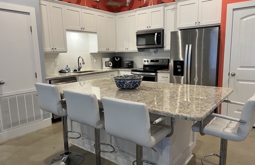 Fully equipped kitchen featuring beautiful granite countertops, plenty of cabinet space and a full-size pantry. Full-size refrigerator, stove, microwave and dishwasher. Keurig coffee maker, dishes, silverware, utensils, pots, pans, cutting boards, mixing bowls, toaster oven, blender, etc. Plenty of seating to eat and entertain at the kitchen island and kitchen table. Comfy cozy beds (Bedroom 1 has one queen and one XL Twin, Bedroom 2 has two Twin over Full bunk beds). Couch, loveseat and recliner to sit and stream tv on the large 70" flat screen TV. Sleeps 6-8. Plenty of room outside for cleaning up fishing gear and space to park your boat and vehicles. Small BBQ grill available.
