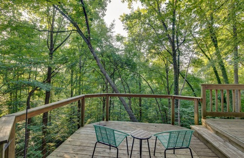 Flanked by an old hardwood forest and up a secluded curving road, The Treehouse is a picturesque, charming A-frame renovated in 2022. An oasis in the middle of all the popular vacation destinations, it is close to downtown Knoxville and all the restaurants, shops, and city attractions. The beautiful stained glass entry doors, vaulted ceilings, skylights, and expansive windows welcome in the private, wooded property. Two bedrooms, new bathrooms, decks, and stylish furnishing will delight you.