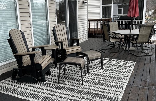 LARGE PRIVATE DOCK – Stairs leading down from deck to the large private dock. Where you have access to Dock TV, Alexa, TV for watching games or late night movies. Polywood Dining Table, and Outdoor seating with Gas Firepit sitting area.