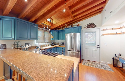 Located just east of downtown Ketchum and Sun Valley, this quiet escape will be just the place to call home base in between runs on the slopes, a round of 18 at the local golf course, or full days of hiking along dramatic ridges. With vaulted ceilings, leather furnishings, and mountain-themed decor, Valley Perch offers that classic rustic feel while still having the modern comforts you are used to. When each day begins, you will have year-round activities to choose from including taking a dip in the shared pool, playing a round of golf, playing tennis on the shared courts, biking along the many paths in the neighborhood, or skiing on Dollar Mountain that is mere minutes away! Regardless of how you use each day, everyone will have built up an appetite. Fortunately, the fantastic full kitchen has everything needed to whip up tasty meals before everyone plops down on the sofa in the living room to stream favorite shows on the flatscreen TV. Don't hesitate to watch the sun go down from the private balcony as well!