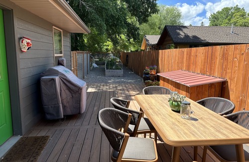 Enjoy the best of both worlds in the heart of downtown Ennis. Feel total sense of privacy as soon as you enter the front gate, with 100% walkability to everything that downtown has to offer. Don't worry about finding parking for your drift boat on Main Street. Park in the large driveway and walk over to the Gravel Bar for a burger and a beer. Or stay in and cook using greens from the garden in the private fenced in yard with two outdoor seating areas and a wood fired sauna. There are resident hens that live in the backyard, you have full access to the brooder box to enjoy their eggs every morning. Fear not dog friends- they are enclosed in a run next to the house. Enjoy your coffee with views of the Madison foothills. You can see all the way to the lake through the large picture windows. We have five garden boxes in the yard, but the real stars of the property are the two American Elm trees that provide shade all summer long and help keep the house nice and cool. That's right, we have two of the last remaining American Elm trees in Montana in the front and backyard. They are so, so special. The house is 900 square feet- made to feel much larger with two decks. This home invites you to pull out your yoga mat, stretch, meditate, and immerse yourself in this peaceful and happy little space.