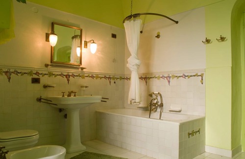 With our apartment you can expect a picturesque jewel on 150 square meters, in a medieval village on a ridge on the Riviera in front of the French border, between Imperia u. San Remo. The apartment gets its flair from old furniture, cross vaults (15th century), trompe l’oeil wall painting, art nouveau windows in the room doors, old mirrors and art nouveau lamps, cotto flooring, valuable fabrics and its special color tones. The 25 sqm terrace overlooks olive groves to the Mediterranean. There are three bedrooms with up to 5 -6 beds in total (see below), a large medium-sized living room, well-equipped kitchen, large bathroom, large hallway, satellite TV, laundry and dishwasher.