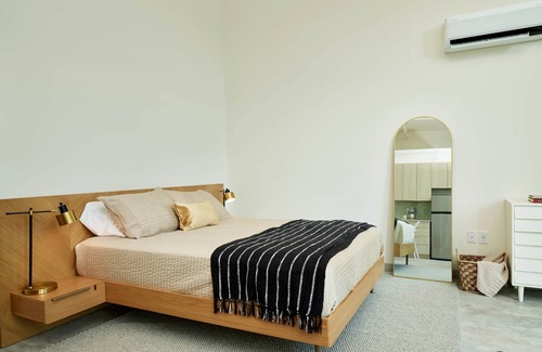 Our stay features a large, spacious studio with an entire wall of 20ft high floor to ceiling windows. In the kitchenette space you will find a two-burner cook top, a fridge/freezer, luxury finishes and spacious countertop/cabinet space. Our stay features on queen size bed and a suede, modular sectional.
