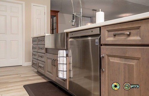 The open kitchen features floor-to-ceiling cabinets, a massive 10 foot island, and stunning quartz countertops. Chefs will enjoy the large five-burner cooktop and built-in oven. Dining options include an eight-person table, seating for four and the island, and four more in the breakfast nook. The kitchen is stocked with basic cookware, tableware, high-end appliances, and a drip coffee maker (filters provided, but please bring your favorite grind). Access the front-loader laundry machines in the room adjacent to the kitchen.