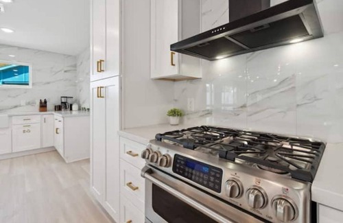 The living room has a jaw-dropping electric fireplace (that changes colors via remote) with a 65 inch 4K TV with built-in Netflix, Amazon Prime Video, YouTube and streaming capabilities. The brand new fully equipped kitchen features a massive 10' island - perfect for chefs to cook their group a feast. The CB2 dining room table that seats 10 will be the perfect place to dine as a group. If you need a fresh outfit, the laundry room is available for your use with laundry supplies, a steamer and Whirlpool appliances.
