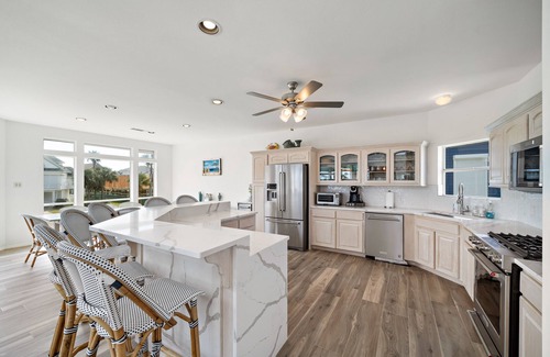 Very spacious 3,200 sq ft home with the perfect floor plan (two masters)! View to the beach from every deck, living room and dining room. This 4 bedroom/3.5 bath home in prestigious Pirates Beach West. Remodeled summer 2021 with ALL New Kitchen Aid SS appliances, ice maker and gas stove. All new remodeled custom walk-in tile bathrooms, double marble vanities, quartz counters, new crisp white interior paint, new designer furniture, 3 NEW very comfortable performance designer special order sofas, 75" TV/Electronics, decorations, Mattresses, beds, bedding with new luxury Sheets/Linens and much more. ENTIRE home is updated with new tile floors, looks like wood, in October 2021. The home looks like a new build. Summer 2024 only renting from Monday-Monday.