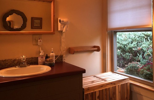 The bathroom has a shower with all the usual amenities plus new towels & soaps provided.