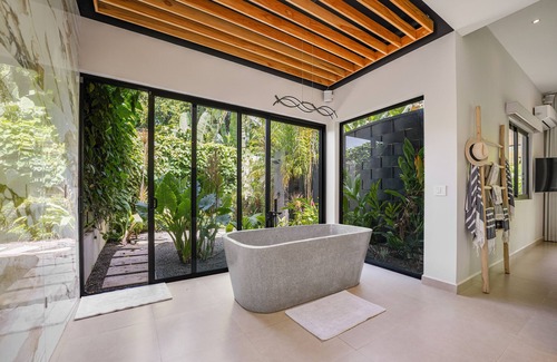 Escape to this marvelous 5-bedroom estate in Playa Grande that has been masterfully designed to offer a perfect blend of shared spaces and private retreats, all while being surrounded by beautiful gardens. With 4 king suites, 2 bunk beds, and 1 queen bed, this retreat is perfect for families or groups of friends. Enjoy the convenience of close beach proximity with a 3 minute walk to Las Bueulas national park, some of the best surf breaks in Costa Rica, surf shops, beach cafes, and wildlife. Immerse yourself in the refreshing 45' saltwater pool, complete with an infinity edge that creates a stunning visual effect and a perfect spot for relaxation and sunbathing. Workout, do yoga or just relax in the shala that overlooks the pool in your private jungle oasis. Enjoy a home cooked meal in the gourmet kitchen with your private chef or enjoy the local cuisine just a short walk away. For your convenience, a 4-seater golf cart is available for rent on-site, making it easy to explore.