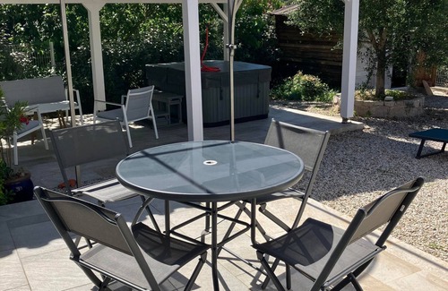 Relax in the hot tub (enjoy the outdoor furniture!) or sip a drink in the garden of this 172-sq-ft condo. For a change of scenery, come inside and enjoy the TV.