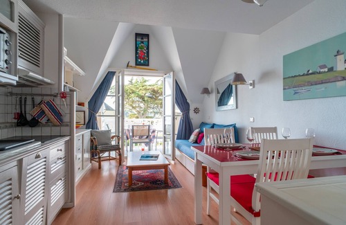 The Cocoonr/Book&Pay agency offers you to rent, in Bénodet, this charming duplex apartment with sea view, at 40 meters of the beach, with shared swimming pool, of a surface of 28 m ² and being able to accomodate until 3 travelers. Located on the 2nd floor (without elevator), it consists of a nice living room of 13 m², open fully equipped kitchen, a nice bedroom, a bathroom (with shower). We are waiting for you !