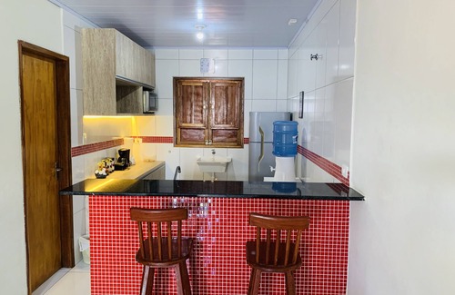 There are two double beds, one in each bedroom and a sofa bed in the living room where two other people can sleep - we provide bed linen and towels. A balcony with hammock for couple, kitchen with closet, microwave, 04 burner stove, blender, microwave, plastic table with 04 chairs, thermal box and all kitchen utensils; We also have service area integrated to the kitchen with sink washbasin. Energy and gas included.