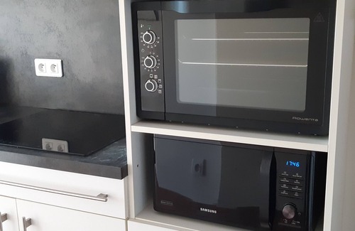 B - Kitchen: Modern and functional, open to living room with a counter, fridge-freezer 2 doors, oven combined microwave, induction hob, extractor, coffee maker + Nespresso capsules, fruit squeezer, dishwasher, washing machine.