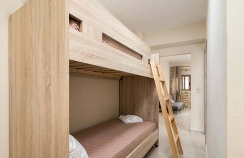 It can accommodate up to 5 guests, as it has 2 bedrooms and an extra sofa bed for the 5th person. The first bedroom has a double bed, dressing table, wardrobe and has a window overlooking the sea. The second bedroom has a bunk bed and a wardrobe.