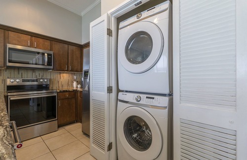 The bright, updated interior showcases a floor-to-ceiling wall of glass that frames the covered balcony and the Gulf beyond. The well-appointed kitchen features a full suite of stainless-steel appliances with a dishwasher, a three-seater breakfast bar, and an indoor dining table set for six. An outdoor dining table is also furnished on the patio for alfresco dining. The open living area offers ample seating and a cable TV. Home essentials include free WiFi, and a washer/dryer.