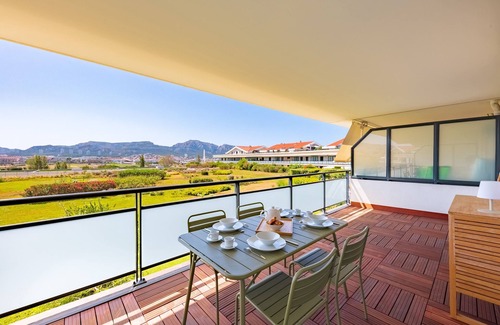 Prado Beach is located on the 3rd floor with elevator in a secure residence. You'll be charmed by its contemporary decor, large terrace and stunning views over the racecourse, Parc Borely and the Massif de Marseilleveyre. You'll enter the main room with a beautiful open-plan kitchen, a TV lounge area, access to the terrace on the ground floor, and on the left, the bedroom with access to the terrace. The terrace is divided into 2 parts, a summer sitting area and a dining area.