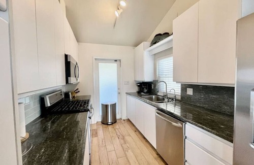 The open design offers 2 separate floors of spacious family rooms with large comfortable sofas, big screen televisions and modern decor. There is a wet bar with a microwave, small fridge and fireplace in the large downstairs family room which opens to the private enclosed front yard leading to the bay-front. Anyone up for a round of foosball?! Well the family room has it! So come and play! The 4 bedrooms are fully furnished with modern decor and spacious custom closets in each room. The 3 bathrooms are vintage in style with modern fixtures and ample counter space and cabinets.