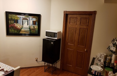 This is a PRIVATE impeccably kept 0ne or Two BEDROOM pet & smoke free SUITE offering 1 full queensize bedroom, a private 4 piece bathroom, living room with reclining leather furniture, a Kitchenette/office area complete with microwave oven, refrigerator, slow-cooker, tea & coffee maker, toaster as well as all china , glassware and plates.. FAST wifi, & a 52inch smart T.V with Netflix is included. Heated floors plus air conditioned for your comfort. Separate thermostats are in each Bedroom and living area.