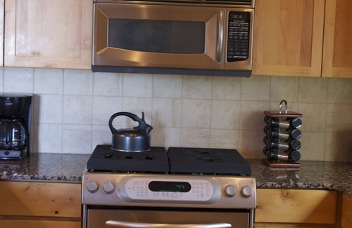 The Pueblo-revival style, freestanding villa with wood-beamed ceilings has a fully-equipped kitchen with a gas stove, full oven, microwave and large refrigerator. Meals can be served at the granite counter area or at the adjacent dining room table that comfortably seats six, eight if needed.