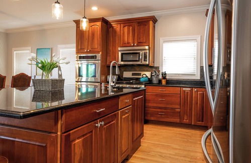 The first floor has two bedrooms with queen beds in each, a large kitchen with granite countertops, stainless steel appliances, three ovens, a breakfast bar and a large dining room table that all together sits 17. We have a high chair available, too.