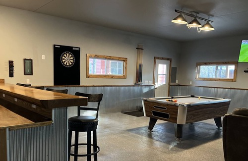 Two bedroom cabin with separate finished & heated pole barn set up for entertaining. Comfortably sleeps 6 with the option to sleep more on the four couches. The cabin is conveniently located off of M37, 15 minutes south of Baldwin. Set on 5 wooded acres, bordered by 450 acres of Federal land with no neighbors in sight. The pole barn has a bar, satellite TV, pool table, dart board, ping pong table, couches, and heated flooring. Perfect for groups hunting/fishing/trail riding, families, and outdoor adventurers!
