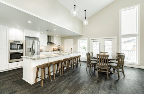 Inside, start your morning enjoying the island views from the open living area. Large windows let the natural light while high ceilings and updated interior finishes brighten the home. The sectional sofa, accent chair and nearby dining table seating 6 make it easy for everyone to spend time together. The fully-equipped kitchen boasts stainless steel appliances, abundant storage, and plenty of counter space to make prepping and serving easy. Send the kids & teens over to the second living area for a game or movie night and close the doors on the noise. Shake up some drinks at the wet bar, and reminisce with your favorite people.