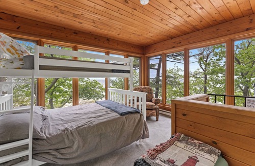 Blue Horizon features 4 bedrooms and 3 bathrooms with a great floor plan to fit your family's needs. The master bedroom has a king bed with an en suite bathroom. The second bedroom has two twin beds, the third bedroom has a queen bed and the second full bathroom is between the two bedrooms. Up the spiral staircase to another sleeping area, is a bunkbed with a twin over full bed. In this loft space, you are surrounded by windows with scenic views of Lake Michigan and the beautiful wooded association surrounding it. Make sure to use the telescope to really take in all the sights. The fourth bedroom and third full bathroom is a studio apartment with its own separate entrance on the lower level of the home! (You have to go outside to access this entrance). This home is not pet friendly.